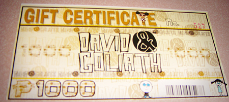 1000 Gift Certificate Published May 6, 2008 at 450 × 201 in Bloggers Suck, Little Losers by David and Goliath Rocks! ← Previous Next → 1000 Gift Certificate